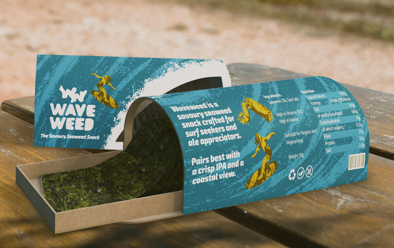 I explored recyclable and biodegradable packaging formats, with a design intended to mimic a breaking wave and a window to reveal the seaweed. I used Shapr3D and Adobe Substance to model and render the packaging, and created supporting visuals such as countertop displays and promotional assets to further bring the brand to life.