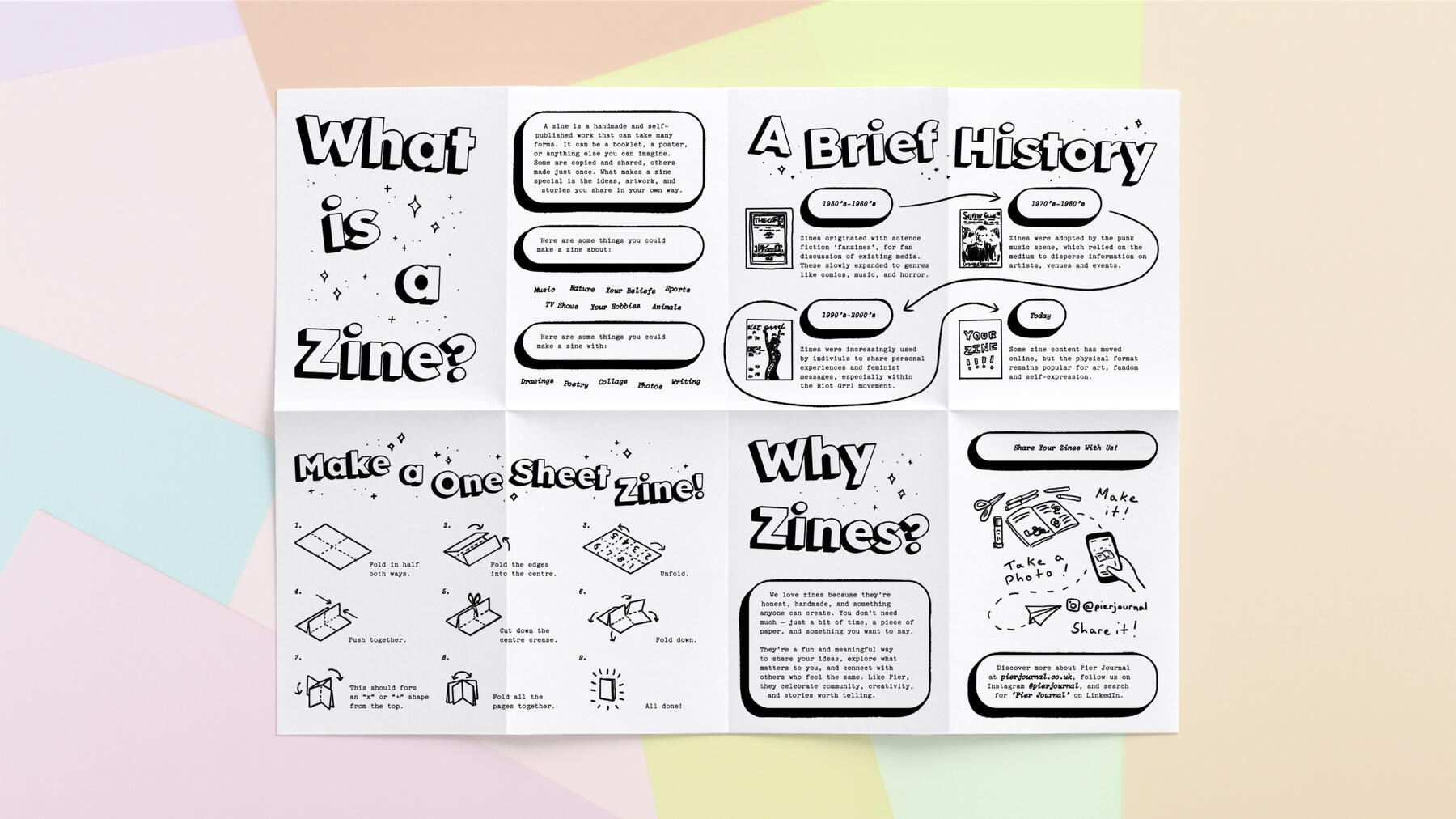 Zine template and supporting materials created for Pier Journal's workshop at We Out Here festival.
